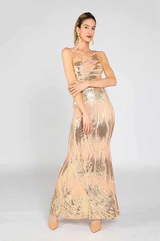 Vestido fiesta talle drapeado hombros bajos manga larga